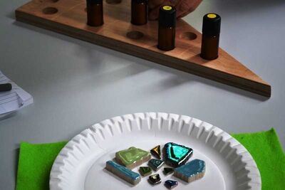 Beim individuellen Erschnuppern konnten sie selbst erleben, wie schnell persönliche Bilder, Erinnerungen oder Gefühle aufsteigen, die unmittelbar mit der eigenen Duft-Lebensgeschichte in Verbindung stehen. Diesen Eindrücken einen individuellen Ausdruck zu verleihen, gelang den begeisterten Teilnehmern, indem sie vorbereitete Kreativ-Angebote mit vielfältigen Materialien für sich ausprobierten und dafür Farben, Stoffe, Stanzer oder Mosaiksteine nutzten. So entstanden sehr individuelle und den persönlichen Assoziationen entsprechende Ausdrucksformen.